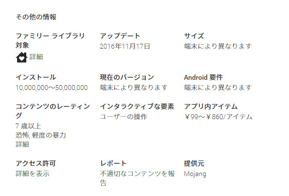 ↑Android版マインクラフトポケットエディションの説明「端末により異なります」の文字が3つ。