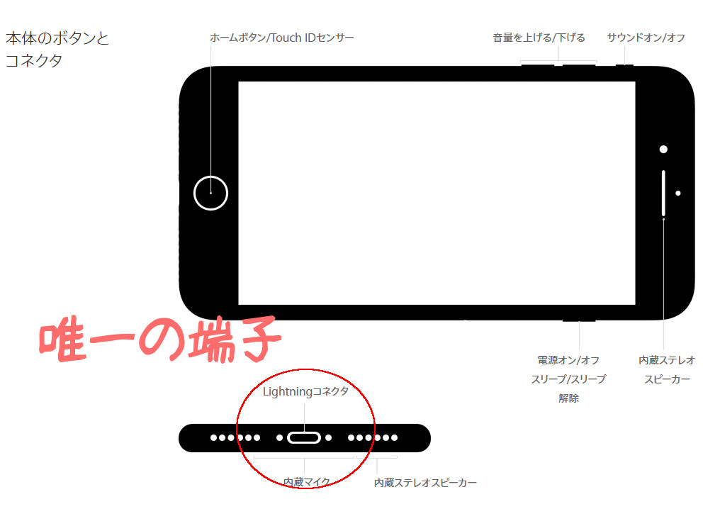 例えば度々話題になる外部接続端子は、iPhoneの場合1つあるだけ、充電もイヤホンもパソコンと接続するUSBも周辺機器もここに接続することになります。
